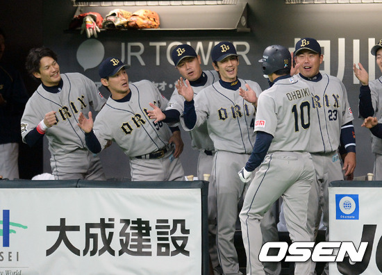 1회초 1사 1,3루에서 유격수 땅볼때 3루 주자 오비키 선취득점을 올리며 동료들의 환영을 받고 있다.