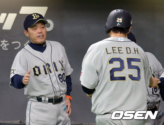 1회초 2사 만루 발디리스 적시타때 3루 주자 이대호 홈에서 득점을 올리며 오카다 감독의 환영을 받고 있다.