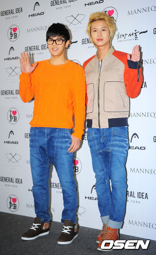 3일 오후 서울 잠실 올림픽공원에서 열린 '2012-2013 춘계 서울패션위크' 최범석 디자이너 패션쇼에서 제국의 아이들 멤버 하민우와 김동준이 포토 타임을 갖고 있다.