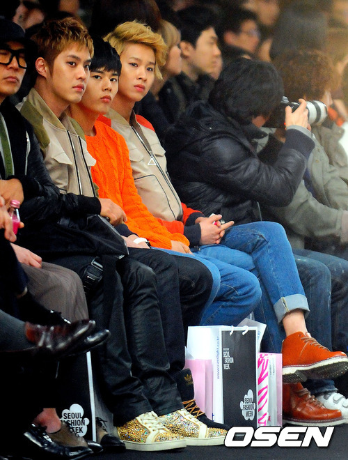 3일 오후 서울 잠실 올림픽공원에서 열린 '2012-2013 춘계 서울패션위크' 최범석 디자이너 패션쇼에서 승호 동준 민우가 패션쇼를 관람 하고 있다.
