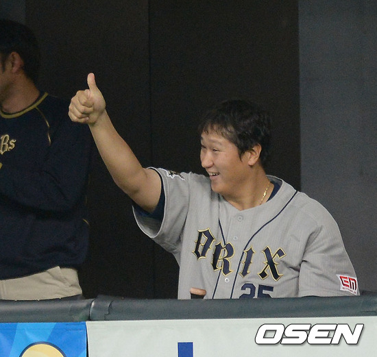 6회초 무사 1,2루 발데리스 동점 적시타때 이대호가 발데리스를 향하여 환호하고 있다.