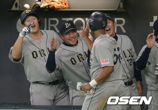 6회초 1사 만루 오비키 적시타때 3루 주자 발디리스 득점을 올리며 덕아웃 동료의 환영을 받고 있다.