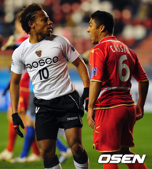 3일 저녁 포항 스틸야드에서 열린 포항 스틸러스와 애들레이드 유나이티드(호주)의 '2012 아시아축구연맹(AFC) 챔피언스리그' 조별리그 E조 3차전 홈 경기에서 전반 포항 아사모아와 애들레이드의 카씨오가 말다툼을 하고 있다.