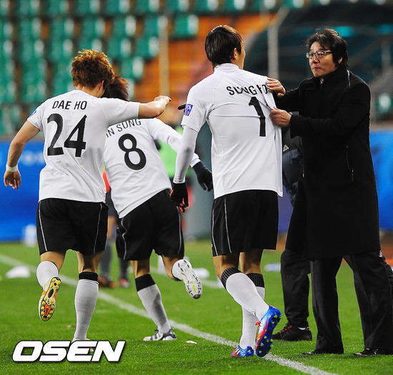 3일 저녁 포항 스틸야드에서 열린 포항 스틸러스와 애들레이드 유나이티드(호주)의 '2012 아시아축구연맹(AFC) 챔피언스리그' 조별리그 E조 3차전 홈 경기에서 후반 포항 김대호가 선취골에 성공한 후 황선홍 감독이 김대호를 비롯한 선수들을 격려하고 있다.
