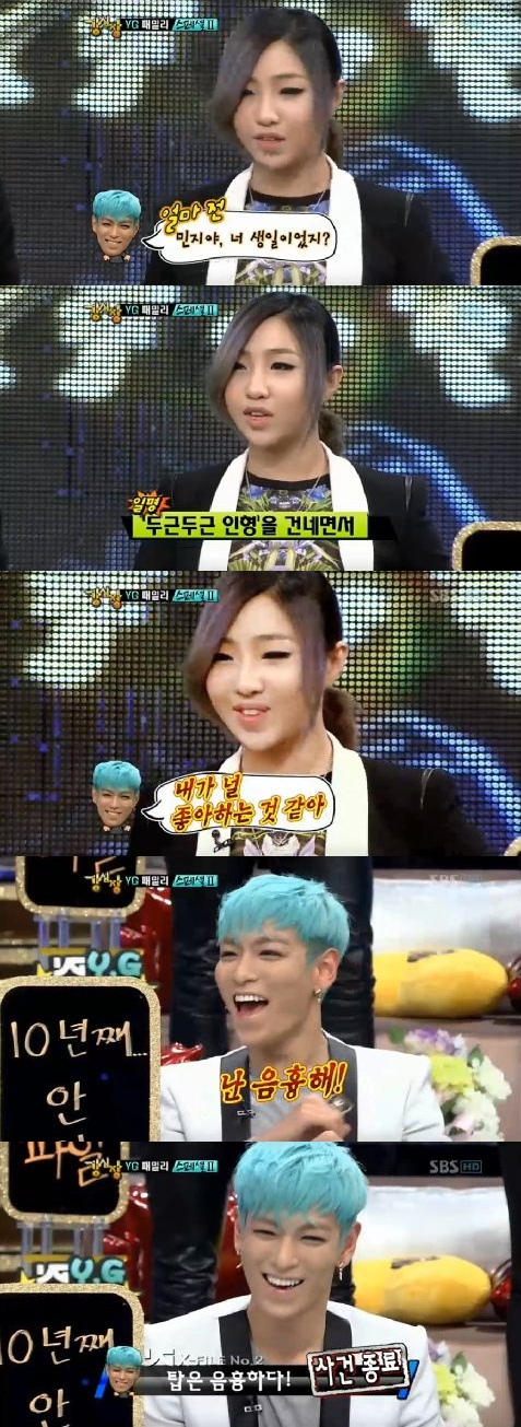 MC 이승기가 "여자에게 선물을 자주 하나"라고 말하자 탑은 "절대 안한다. 민지 생일이라서 아끼는 곰돌이 인형이 있는데 잘 어울릴 것 같아서 선물했다"고 설명했다.