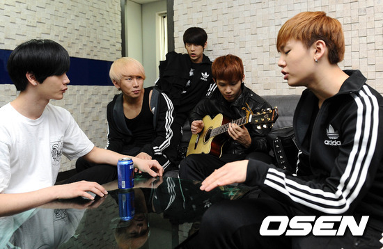 그룹 비투비가 휴식 중 임현식의 기타 연주에 맞춰 노래를 부르고 있다.