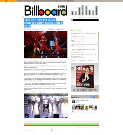빌보드 브라질은 "칠레와 페루, K-POP 트리오 JYJ로 인해 팬들 환호"라는 헤드라인을 내걸고 JYJ의 남미 투어 소식을 전했다.