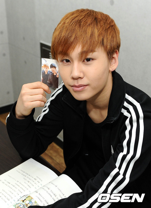 비투비 정일훈이 일본어 공부 중 대만의 한 팬이 보낸 사진을 취재진에게 보이고 있다.