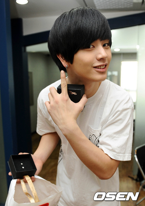 비투비 육성재가 팬에게 선물 받은 귀고리를 취재진에게 보이고 있다.