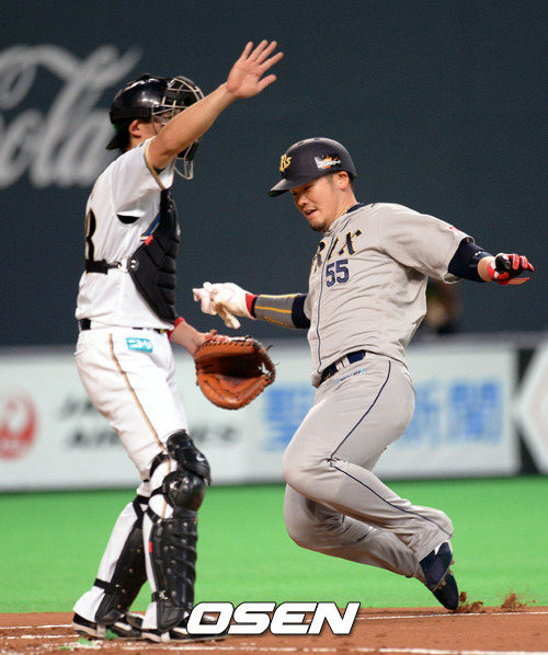 2회초 1사 1루 발디리스 적시타때 1루 주자 T-오카다 선취 득점을 올리고 있다.
