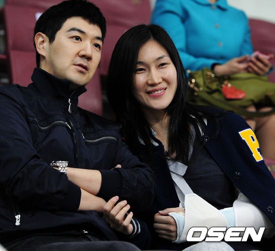 4일 오후 안양 실내체육관에서 열린 '2011-2012 KB국민카드 프로농구' 챔피언결정전 5차전 안양 KGC 인삼공사와 원주 동부의 경기, 경기전 한상진, 박정은 부부가 다정한 모습으로 코트를 바라보고 있다.