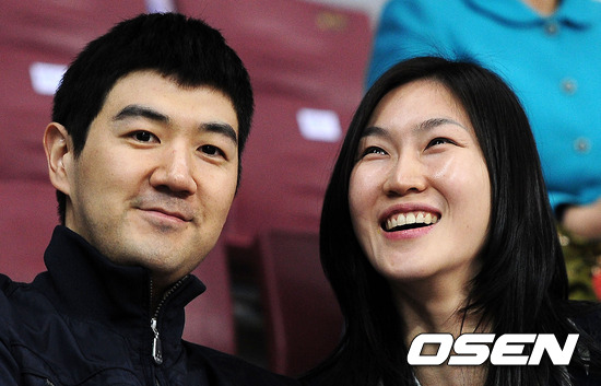 4일 오후 안양 실내체육관에서 열린 '2011-2012 KB국민카드 프로농구' 챔피언결정전 5차전 안양 KGC 인삼공사와 원주 동부의 경기, 경기전 한상진 박정은 부부가 다정한 모습으로 코트를 바라보고 있다.