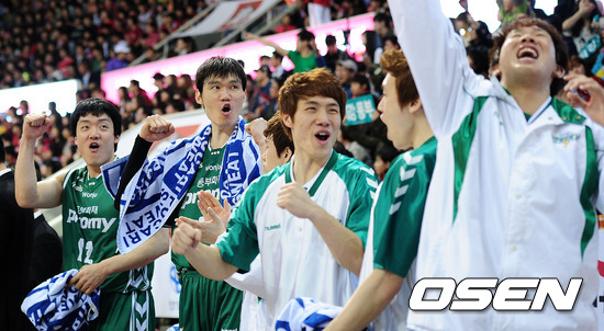 4일 오후 안양 실내체육관에서 열린 '2011-2012 KB국민카드 프로농구' 챔피언결정전 5차전 안양 KGC 인삼공사와 원주 동부의 경기, 2쿼터 동부가 10점 이상으로 앞서가자 벤치의 선수들이 기뻐하고 있다.