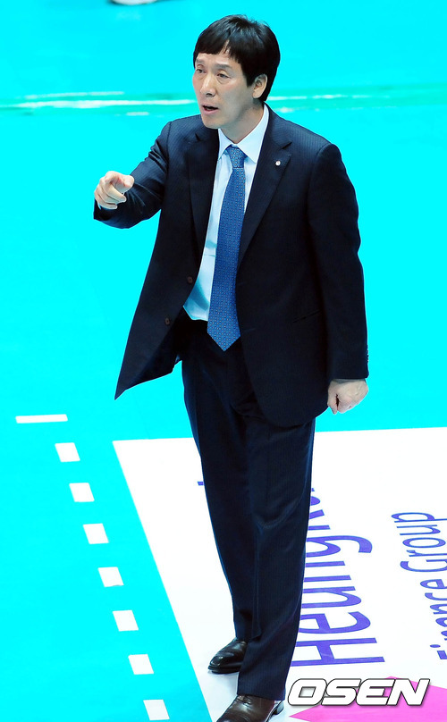 4일 오후 인천 도원체육관에서 열린 '2011-2012 NH농협 V리그' 남자부 플레이오프 3차전 대한항공과 현대캐피탈의 경기 1세트 대한항공 신영철 감독이 선수들에게 지시를 하고 있다.