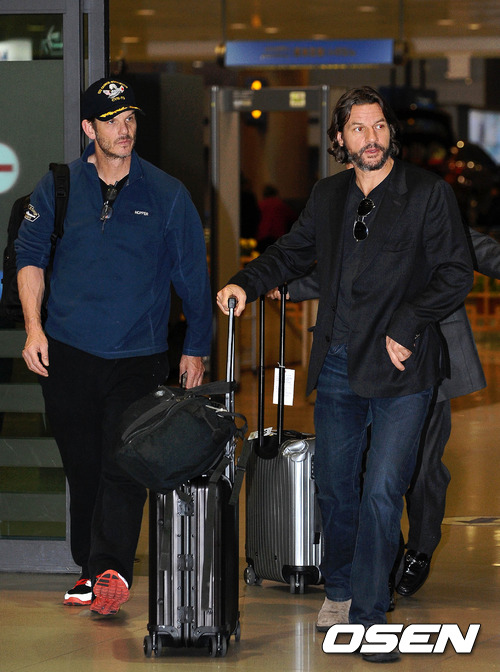 4월 11일 전세계 개봉을 앞두고 있는 영화 '배틀쉽' 홍보를 위해 4일 오후 인천국제공항을 통해 입국한 피터 버그 감독(왼쪽)이 지인과 입국장을 나가고 있다.