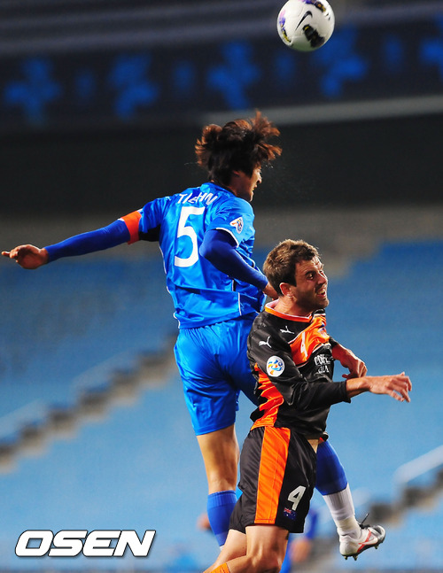 4일 저녁 울산 문수축구경기장에서 열린 울산 현대와 브리즈번 로어(호주)의 '2012 아시아축구연맹(AFC) 챔피언스리그' 조별리그 F조 3차전에서 전반 곽태휘가 공중볼을 먼저 따내고 있다.
