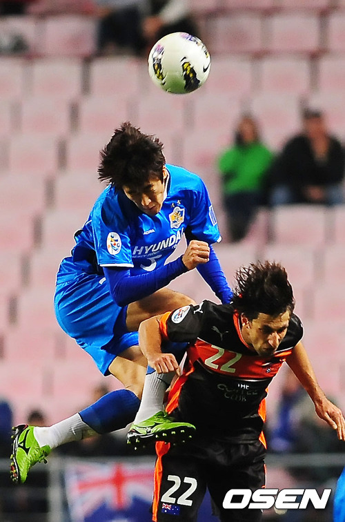 4일 저녁 울산 문수축구경기장에서 열린 울산 현대와 브리즈번 로어(호주)의 '2012 아시아축구연맹(AFC) 챔피언스리그' 조별리그 F조 3차전에서 후반 울산 이재성이 공중볼을 따내고 있다.