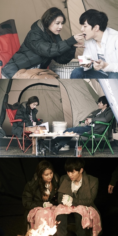 공개된 사진 속 두 사람은 아늑한 텐트 안에서 함께 음식을 준비하며 서로 먹여주고 다정히 마주앉아 곡을 쓰는 등 알콩 달콩한 모습을 보이고 있다. 특히 작사에 열중한 김소은과 다정한 눈빛으로 그를 바라보는 준호의 모습이 마치 이제 막 사랑을 시작한 연인처럼 풋풋해 더욱 촬영 스태프들의 부러움을 샀다는 후문이다.