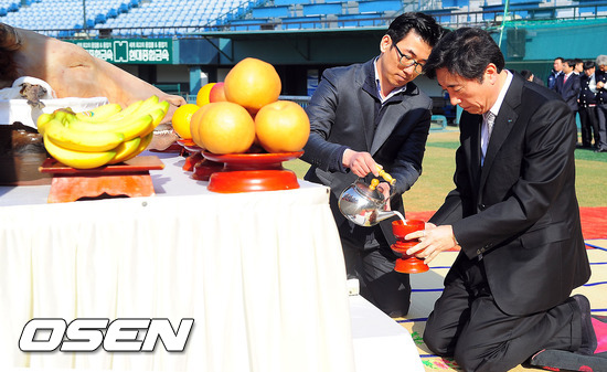 5일 오전 서울 잠실구장에서 두산 베어스의 2012시즌 우승 및 안전 기원제에서 두산 김승영 사장이 고사를 지내고 있다.