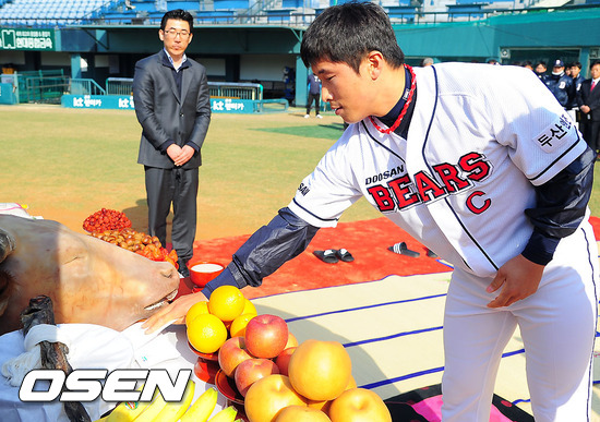 5일 오전 서울 잠실구장에서 두산 베어스의 2012시즌 우승 및 안전 기원제에서 두산 임재철이 고사를 지내고 있다.