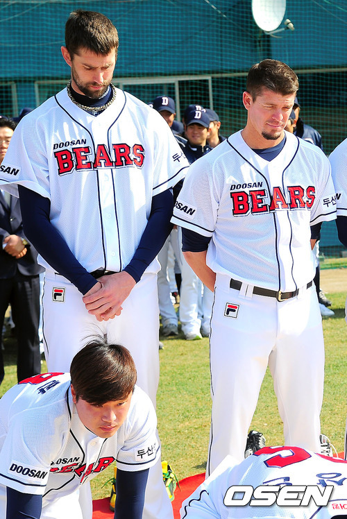 5일 오전 서울 잠실구장에서 두산 베어스의 2012시즌 우승 및 안전 기원제에서 두산 프록터와 니퍼트가 묵념을 하고 있다.