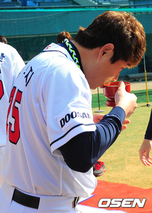 5일 오전 서울 잠실구장에서 두산 베어스의 2012시즌 우승 및 안전 기원제에서 두산 양의지가 음복하고 있다.