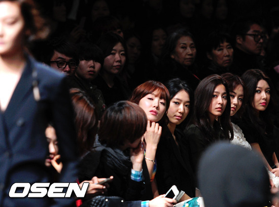 5일 오전 서울 잠실 올림픽공원에서 열린 '2012-2013 춘계 서울패션위크' 송자인 디자이너 패션쇼에서 소이현, 박신혜, 박세영, 소녀시대 수영이 모델을 바라 보고 있다.