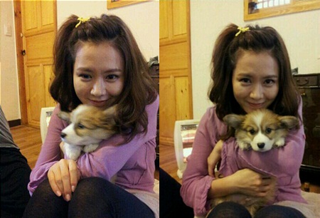 사진 속 손예진은 앞머리를 정수리 쪽 부분으로 올려 묵는 일명 사과머리를 한 모습으로, 연예계 최강 동안다운 매력을 뽐내고 있다. 그녀의 품에 쏙 안긴 강아지가 사진에 귀여움을 더하는 느낌이다.