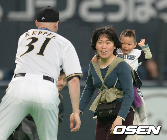 경기에 앞서 니혼햄 팬들을 위한그라운드를 도는 이벤트 행사에서 일본 열성패 모자가 니혼햄 캐펠과 하이파이브를 하고 있다.