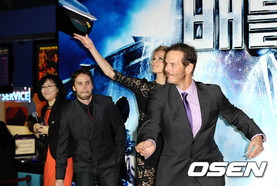 5일 오후 서울 삼성동 메가박스 코엑스에서 열린 영화 '배틀쉽' (감독 피터 버그) 레드카펫 시사회에서 배우 테일러 키취, 브루클린 데커, 피터버그 감독 사인 모자를 팬들을 향해 던지고 있다.