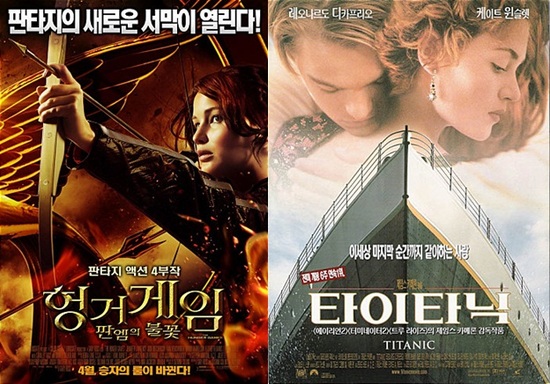 ‘헝거게임’은 독재국가 판엠이 체제를 유지하기 위해 만든 생존 전쟁인 헝거게임에 던져진 주인공 캣니스가 세상의 룰을 바꾸어가며 벌이는 운명과 목숨을 건 결전, 그리고 그를 중심으로 벌어지는 거대한 혁명의 이야기를 다룬 영화이며 '타이타닉 3D'는 레오나르도 디카프리오와 케이트 윈슬렛의 아름다운 사랑 이야기를 담은 작품이다.
