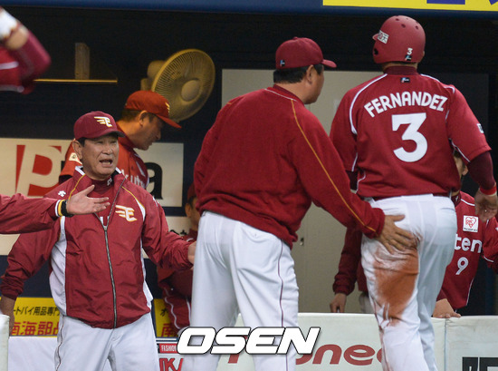 2회초 1사 1,3루 라쿠텐 다카스 적시타때 3루주자 나카무라 선취득점을 올리며 호시노 감독의 환영을 받고 있다.