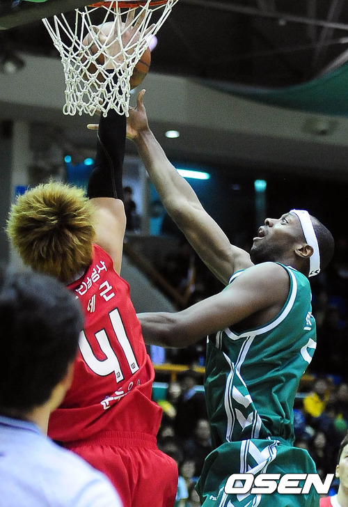 6일 오후 원주 치악체육관에서 열린 '2011-2012 KB국민카드 프로농구' 챔피언결정전 6차전 원주 동부와 안양 KGC 인삼공사의 경기 1쿼터 동부 벤슨이 골밑슛을 시도하고 있다.