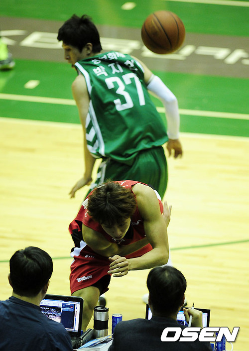 6일 오후 원주 치악체육관에서 열린 '2011-2012 KB국민카드 프로농구' 챔피언결정전 6차전 원주 동부와 안양 KGC 인삼공사의 경기, 2쿼터 인삼공사 김태술이 볼을 살려내며 기자석으로 돌진하고 있다.