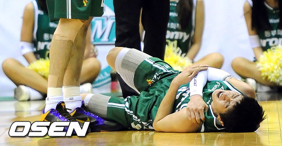 6일 오후 원주 치악체육관에서 열린 '2011-2012 KB국민카드 프로농구' 챔피언결정전 6차전 원주 동부와 안양 KGC 인삼공사의 경기 동부 박지현이 KGC 김태술과 충돌해 코트위에 넘어져 있다.