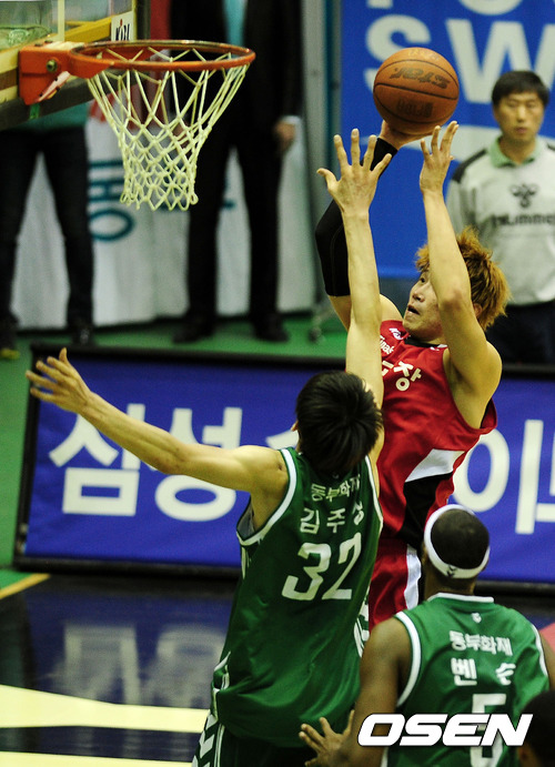6일 오후 원주 치악체육관에서 열린 '2011-2012 KB국민카드 프로농구' 챔피언결정전 6차전 원주 동부와 안양 KGC 인삼공사의 경기, 2쿼터 인삼공사 오세근이 동부 김주성의 수비를 피해 골밑슛을 시도하고 있다.