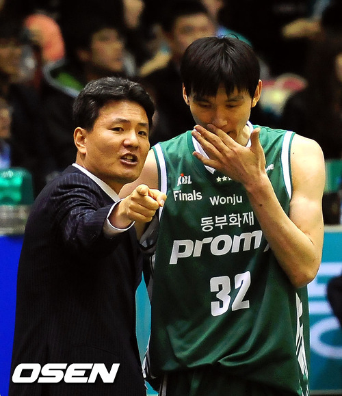 6일 오후 원주 치악체육관에서 열린 '2011-2012 KB국민카드 프로농구' 챔피언결정전 6차전 원주 동부와 안양 KGC 인삼공사의 경기 2쿼터 김영만 코치가 김주성과 이야기를 나누고 있다.
