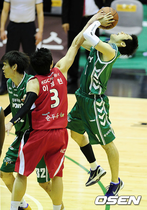 6일 오후 원주 치악체육관에서 열린 '2011-2012 KB국민카드 프로농구' 챔피언결정전 6차전 원주 동부와 안양 KGC 인삼공사의 경기, 4쿼터 인삼공사 이정현이 동부 이광재를 슛블록하고 있다.