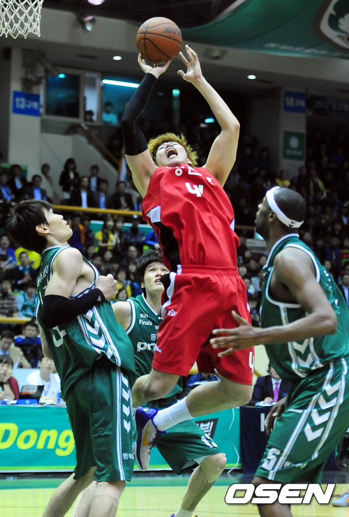 6일 오후 원주 치악체육관에서 열린 '2011-2012 KB국민카드 프로농구' 챔피언결정전 6차전 원주 동부와 안양 KGC 인삼공사의 경기 4쿼터 오세근이 골밑슛을 시도하고 있다.