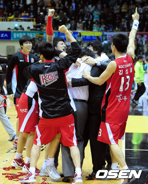 이상범 감독이 지휘하는 안양 KGC인삼공사는 6일 원주 치악체육관에서 열린 '2011-2012 KB국민카드 프로농구' 챔피언결정전 6차전 원주 동부와 원정 경기서 66-64로 승리를 거뒀다.
