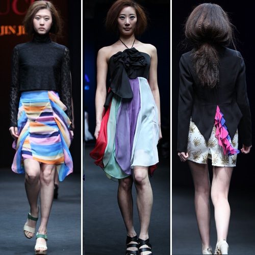특히 블랙 상의와 컬러풀한 치마 매치는 어둠속에 숨겨진 여성들의 여러가지 속마음을 표현한 듯 했다. 더불어 상의 뒤쪽 엉덩이 부분에 여우의 꼬리를 연상시키는 디자인은 관객들의 눈길을 끌만큼 독특했다.