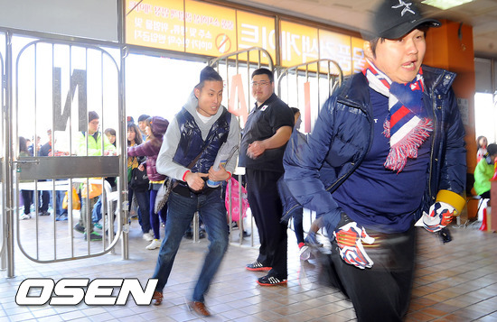 7일 오후 부산 사직구장에서 열리는 2012 팔도 프로야구 개막전 롯데 자이언츠와 한화 이글스의 경기 전 롯데 팬들이 급하게 입장하고 있다.