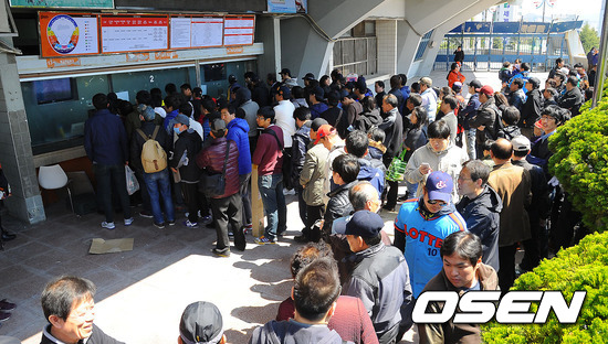 7일 오후 부산 사직구장에서 열리는 2012 팔도 프로야구 개막전 롯데 자이언츠와 한화 이글스의 경기 전 수많은 팬들이 줄서서 기다리고 있다.