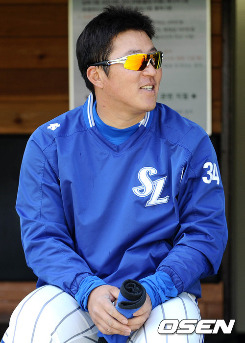 7일 오후 대구야구장에서 열린 '2012 팔도 프로야구' 삼성 라이온즈와 LG 트윈스의 개막전 경기, 경기 전 삼성 최형우가 인터뷰를 하며 환하게 웃고 있다.