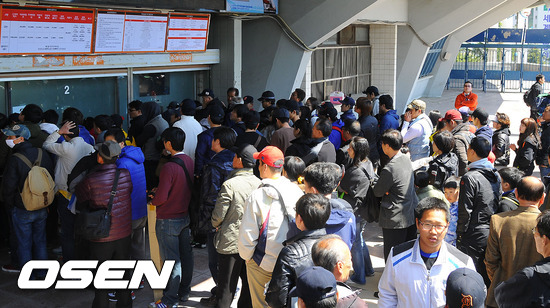 7일 오후 부산 사직구장에서 열리는 2012 팔도 프로야구 개막전 롯데 자이언츠와 한화 이글스의 경기 전 수많은 팬들이 줄서서 기다리고 있다.