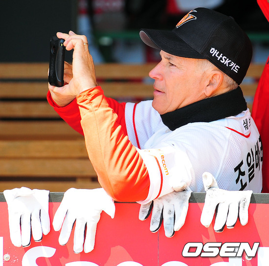 7일 오후 인천 문학구장에서 '2012 팔도 프로야구' SK 와이번스와 KIA 타이거즈의 2012시즌 공식 개막전이 열릴 예정인 가운데 양 팀 훈련시간에 SK 조알바레즈 코치가 관중석쪽을 찍고 있다.