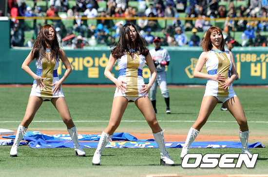 7일 오후 대구야구장에서 열린 '2012 팔도 프로야구' 삼성 라이온즈와 LG 트윈스의 개막전 경기, 경기 전 치어리더들이 화려한 공연을 펼치고 있다.