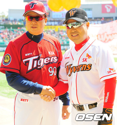 7일 오후 인천 문학구장에서 '2012 팔도 프로야구' SK 와이번스와 KIA 타이거즈의 2012시즌 공식 개막전이 열릴 예정인 가운데 개막식 행사 중 KIA 선동렬 감독과 SK 이만수 감독이 악수를 나누고 있다.