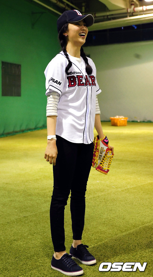 경기전 박하선이 자신이 던진공이 엉뚱한 곳으로 날아가자 민망한듯 웃고 있다.
