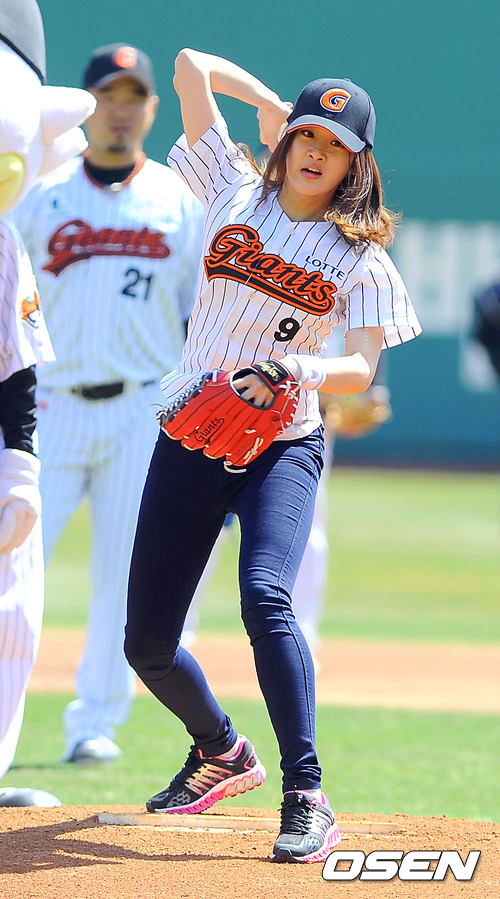 7일 오후 부산 사직구장에서 열린 2012 팔도 프로야구 개막전 롯데 자이언츠와 한화 이글스의 경기 전 배우 강소라가 시구를 하고 있다.